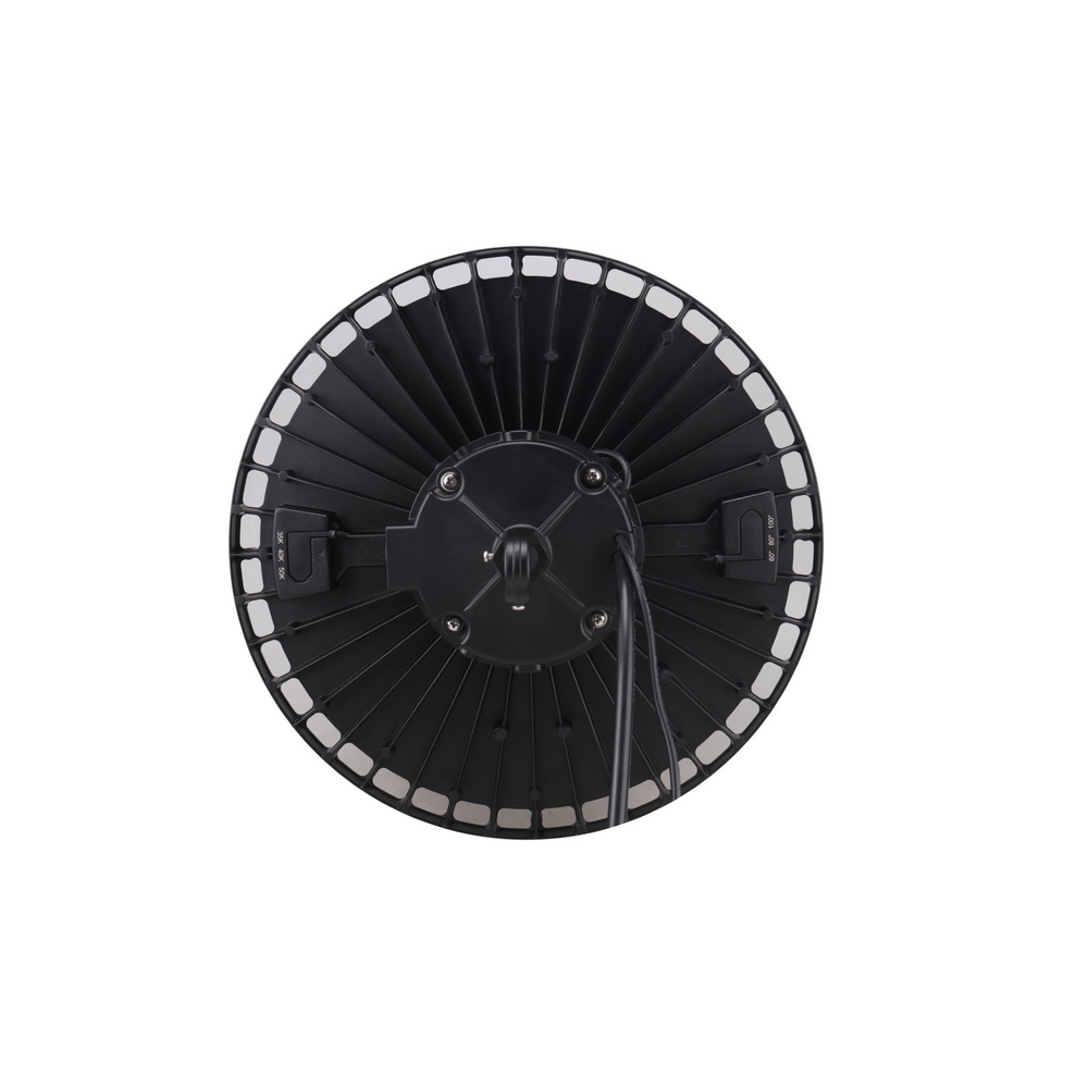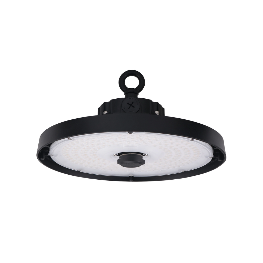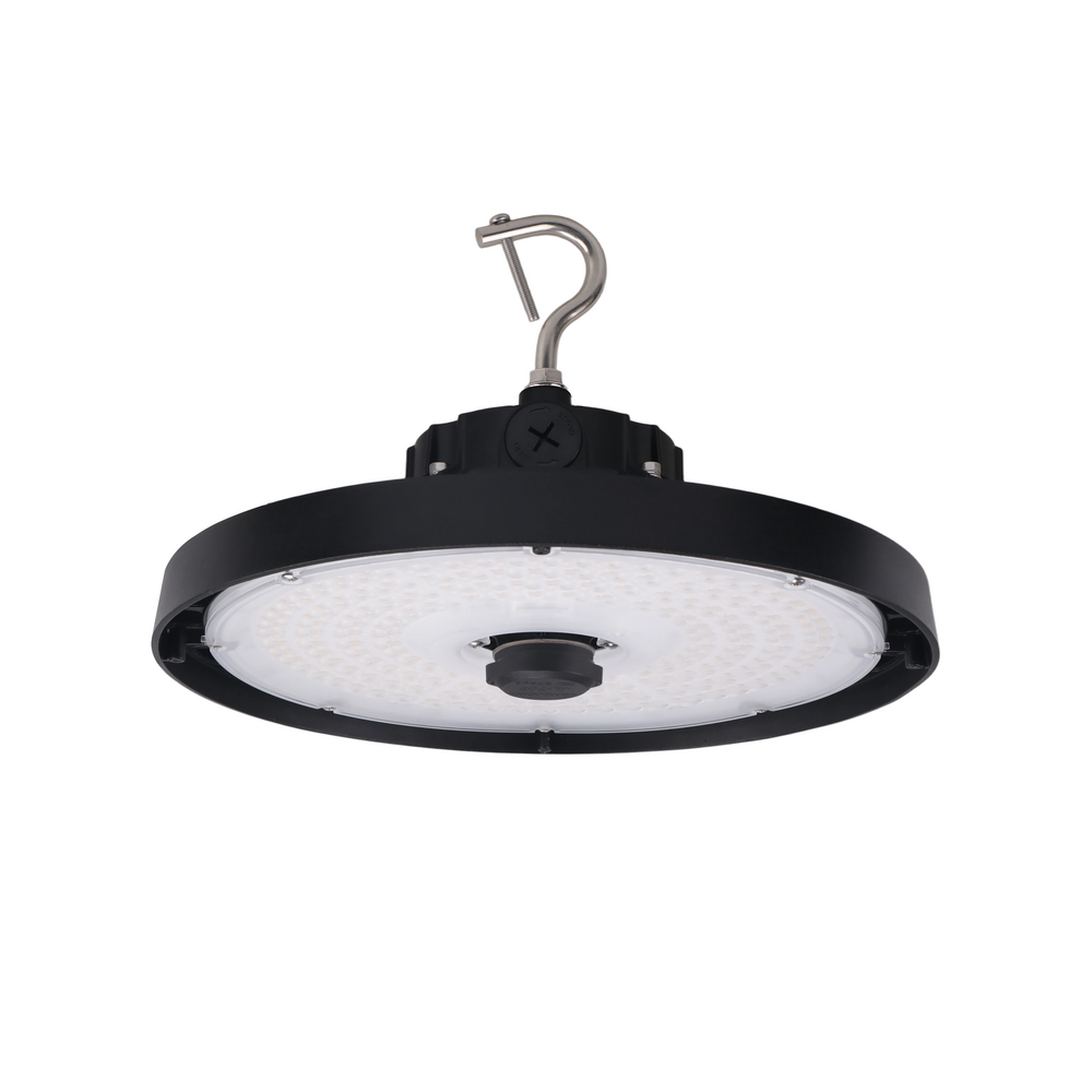 The UFO Series is an LED high-bay solution designed for large open spaces such as warehouses, factories, hangars, gyms, and warehouse-style retail environments. The series features a Z10 sensor receptacle compatible with 4-pin sensors and offers selectable color temperature, wattage, and optical distributions.